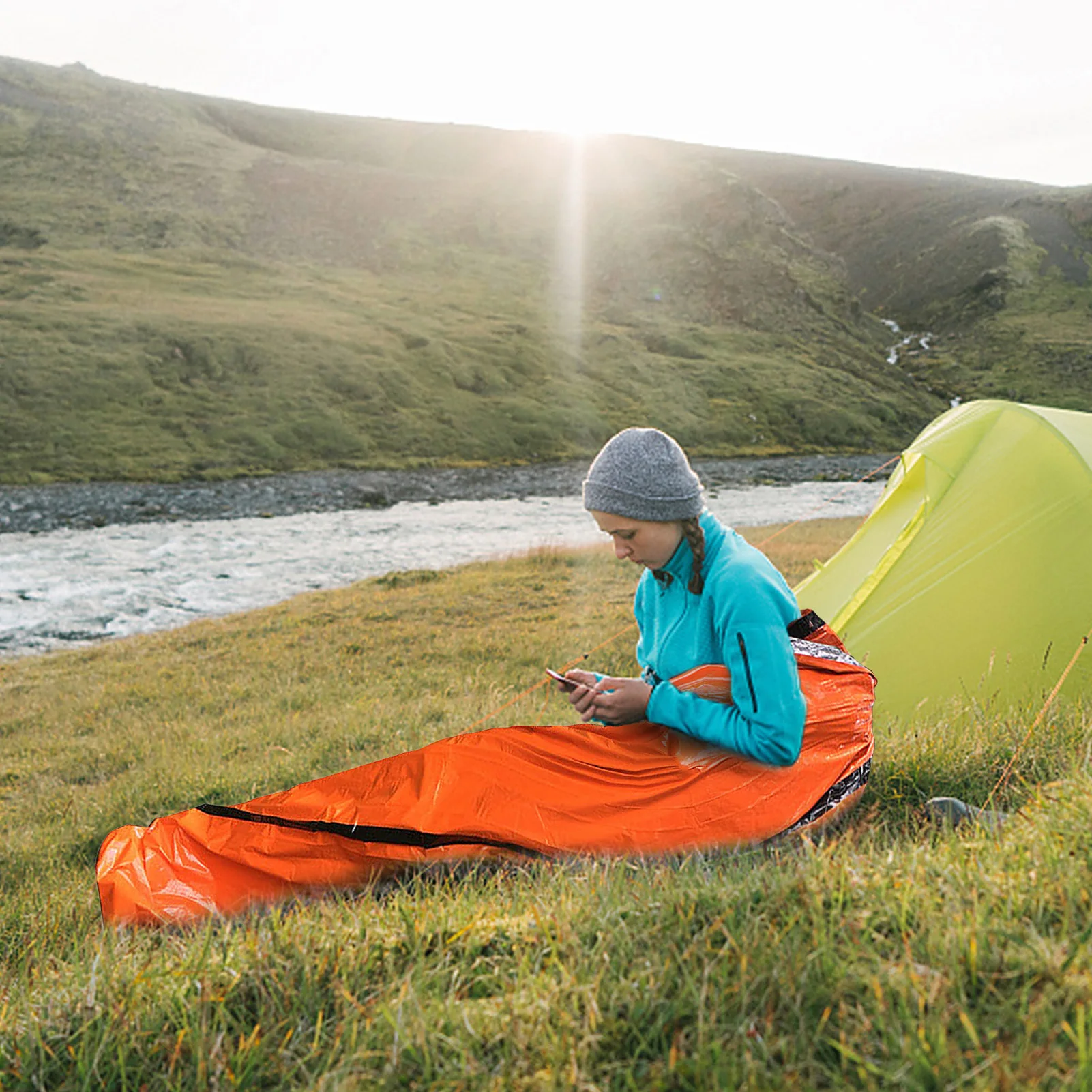 La trousse d’urgence comprend un sac de couchage et une tente, qui sont tous deux fabriqués en matériau PE imperméable et revêtement réfléchissant la chaleur pour vous garder au chaud et au sec, équipement d’urgence indispensable pour le camping, randonnée, randonnée, survie, aventure, etc.