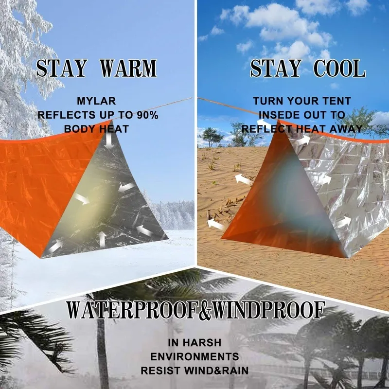 La tente peut garder votre tempĂ©rature en cas d’urgence. FabriquĂ© en mylar isolant de haute qualitĂ©, la fonction de coupe-vent et impermĂ©able amĂ©liore sa durabilitĂ©, et ils peuvent ĂȘtre rĂ©utilisĂ©s et dĂ©chirĂ© rĂ©sistant Ă la perforation.
