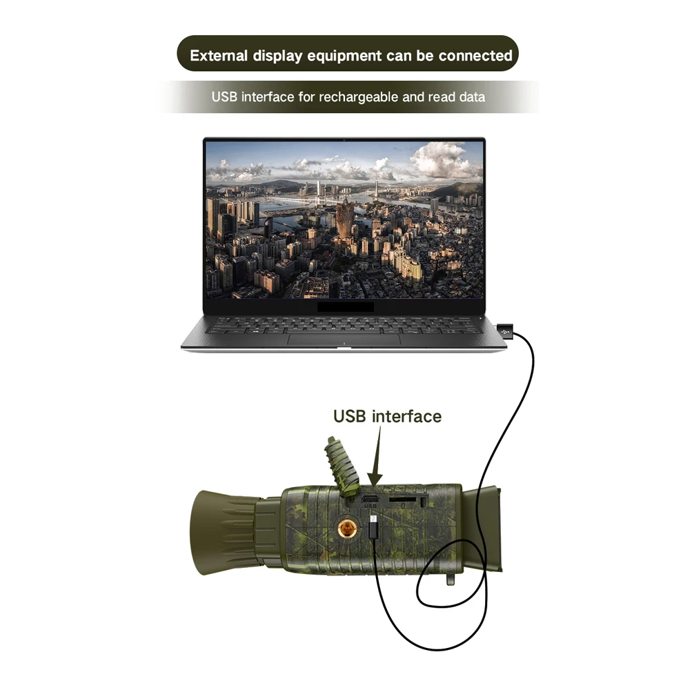 【Connexion PC 】: L’appareil de vision nocturne est équipé d’une interface USB, connectez le spectateur à l’équipement PC par câble USB. Suopprt lire le contenu de la carte mémoire, et vous pouvez utiliser le câble USB pour le recharger.